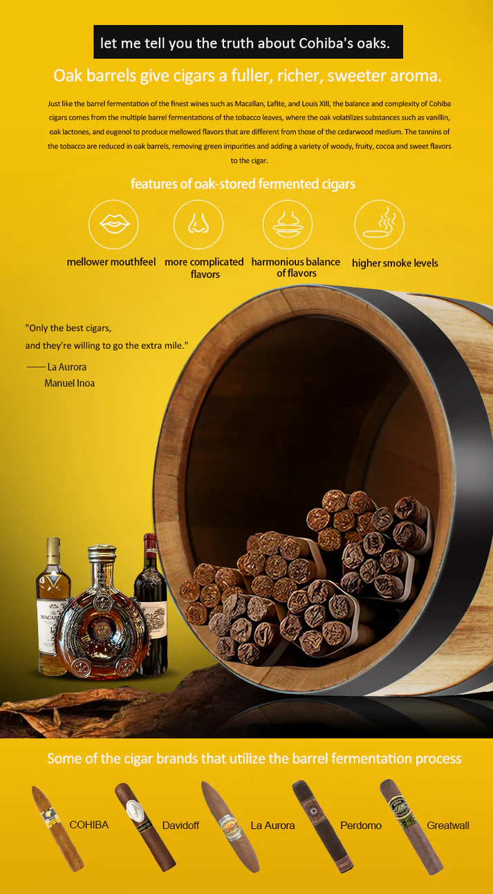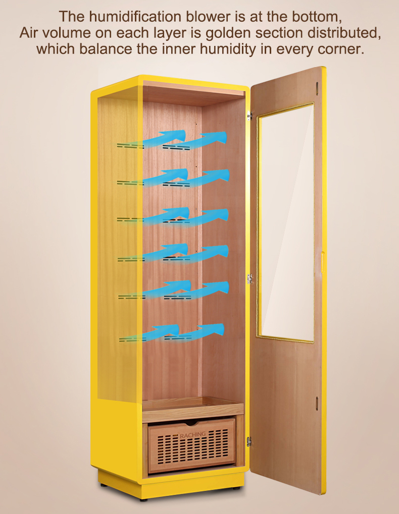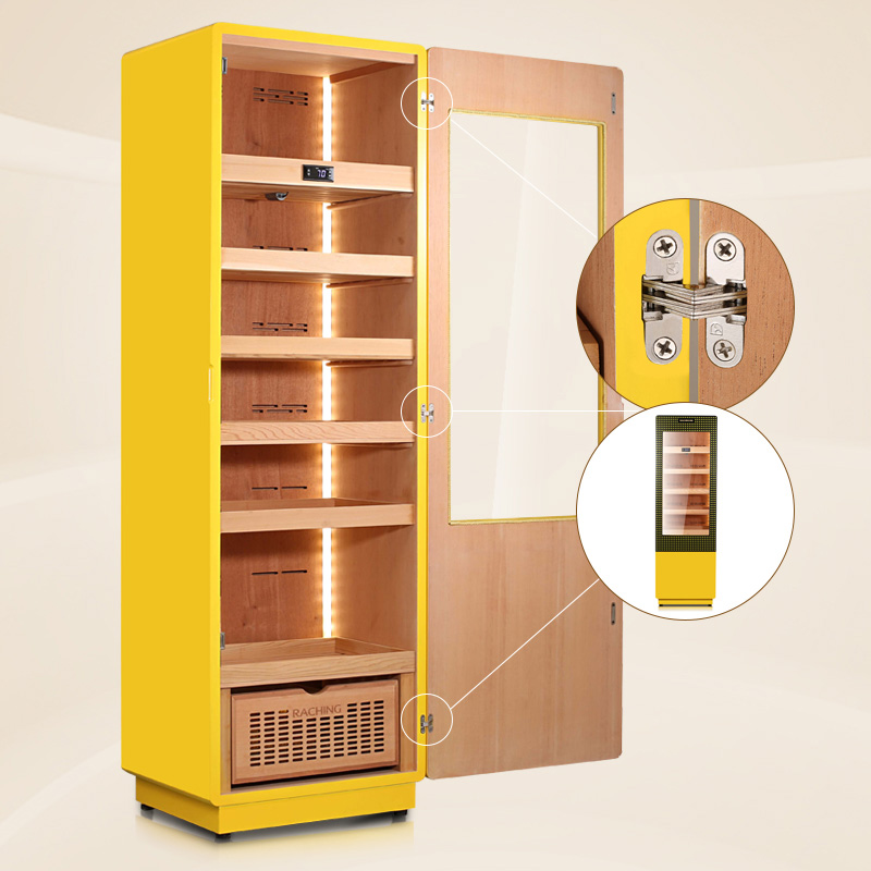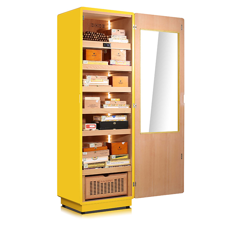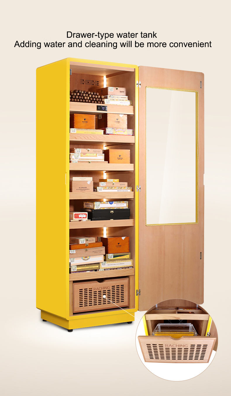This striking yellow humidor is more than just a fashionable conversation piece - it's also the first cigar cabinet in the world to create an oak medium with constant temperature and humidity! Imported North American oak serves as both shelves and interior liner, allowing the cigars to experience the same natural benefits of barrel-fermented cigars: a mellower mouthfeel, richer aroma, deeper flavor, and higher smoke levels! The exterior presents a classic COHIBA high-gloss yellow piano finish with sleek craftsmanship and invisible back cooling components for a minimalist touch. The smooth double-arc chamfered door sets itself apart from traditional cigar cabinet's sharp corners and edges with stylish curves that stand out, while still boasting a classic wooden interior frame and invisible handle to blend in. A security lock prevents unintentional opening and protects your collection, and COB lights provide softer and more uniform lighting than LEDS while remaining highly visible to show off in style. Refrigeration fins collects all of the condensation within to fully separate moisture, and the HBP compressor provides frost-free air-cooling to trap less moisture and lock in the aroma, flavor, and firm shape and beauty of your cigars! A bottom drawer-type water tank allows for easy access for adding water, cleaning, or other routine maintenance. A “Geothermal” PTC thermal compensation system avoids the typical trappings of uneven humidifying by simulating home underfloor heating, allowing hot air to naturally rise and leading to a humidity variation level of less than 2% between top and bottom of the cabinet.